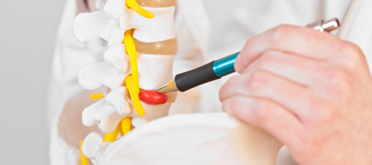 Discs are the protective shock-absorbing pads between the bones of the spine. Though they do not actually 'slip' discs may split or rupture. This can cause the disc to fail, allowing the gel to escape into the surrounding tissue. The leaking jellylike substance can place pressure on the spinal cord or on a single nerve fiber and cause pain either and around the damaged disk or anywhere along the area controlled by that nerve. This condition is also known as herniated rupture, prolapse, or more commonly, slipped disc.